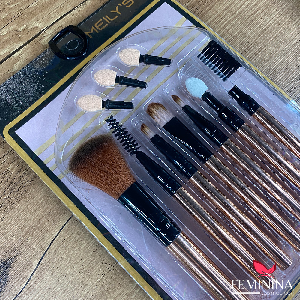 01 Pincel para pó, 01 pincel para sombra, 01 pincel para lábios, 01 pincel chanfrado para sobrancelhas ou delinear, 01 pincel para sombra, 01 pincel pente para cílios e sobrancelhas, 01 pincel para sobrancelha.