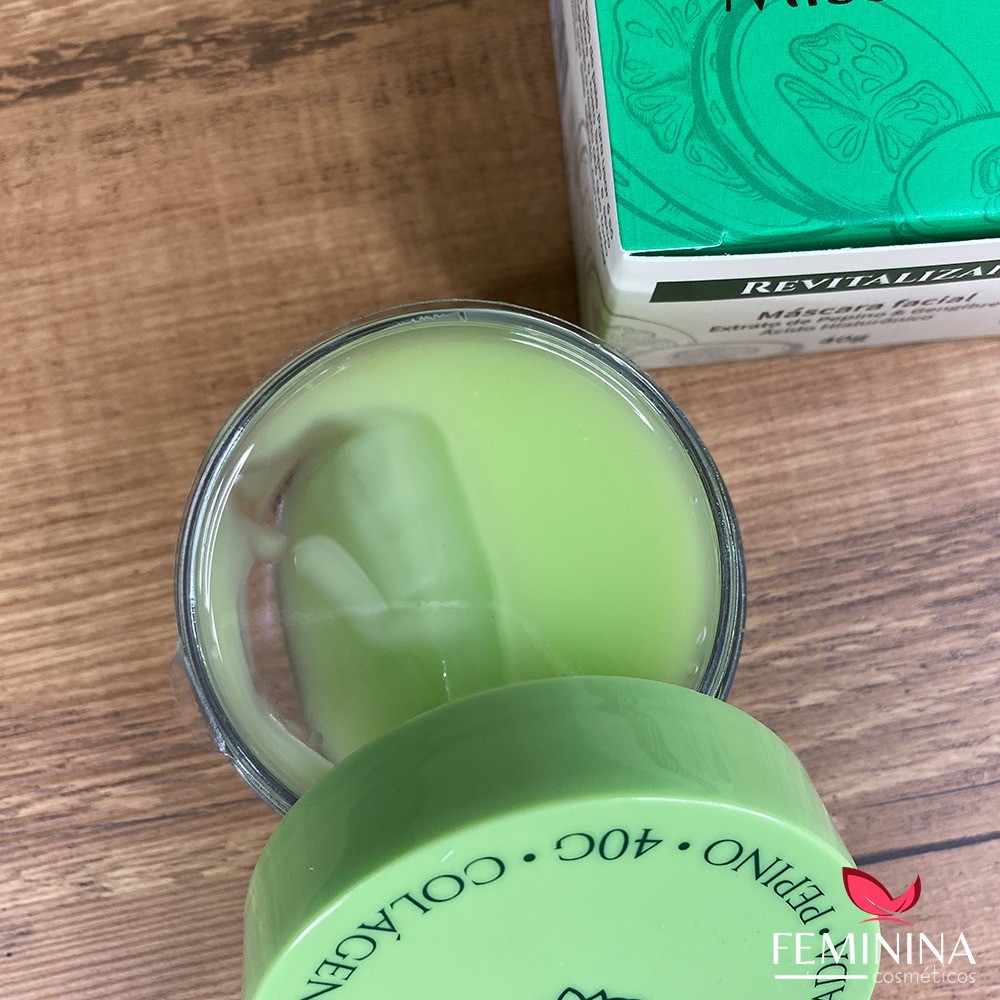 A Máscara Facial Revitalizante Miss Lary fórmula vegana com extrato de pepino & gengibre e ácido hialurônico, indicado para uso diário e noturno, pele revitalizada e iluminada, fórmula rica em ativos naturais, pele hidratada.