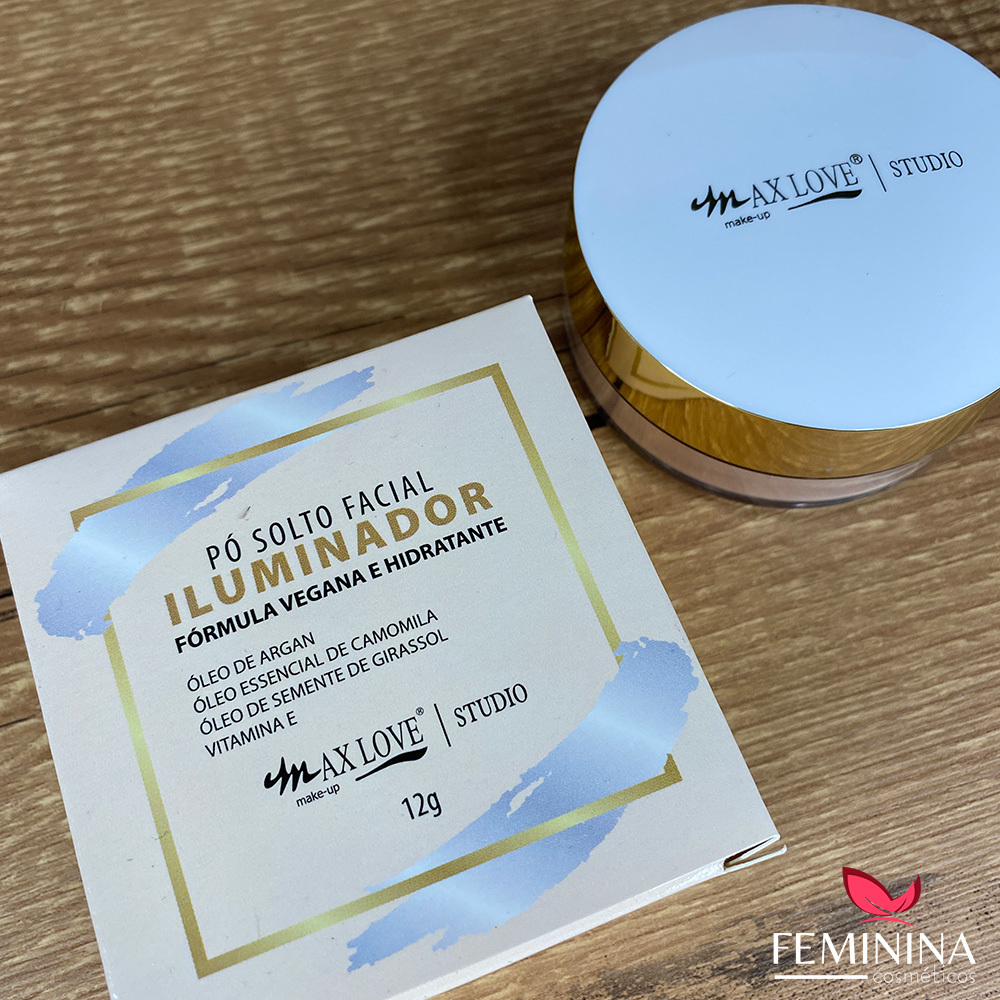 O Pó Solto Facial Iluminador Max Love Possui fórmula vegana e hidratante. Incluindo em sua composição vitamina E, óleo de argan, óleo de camomila e óleo de girassol.